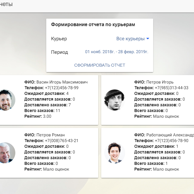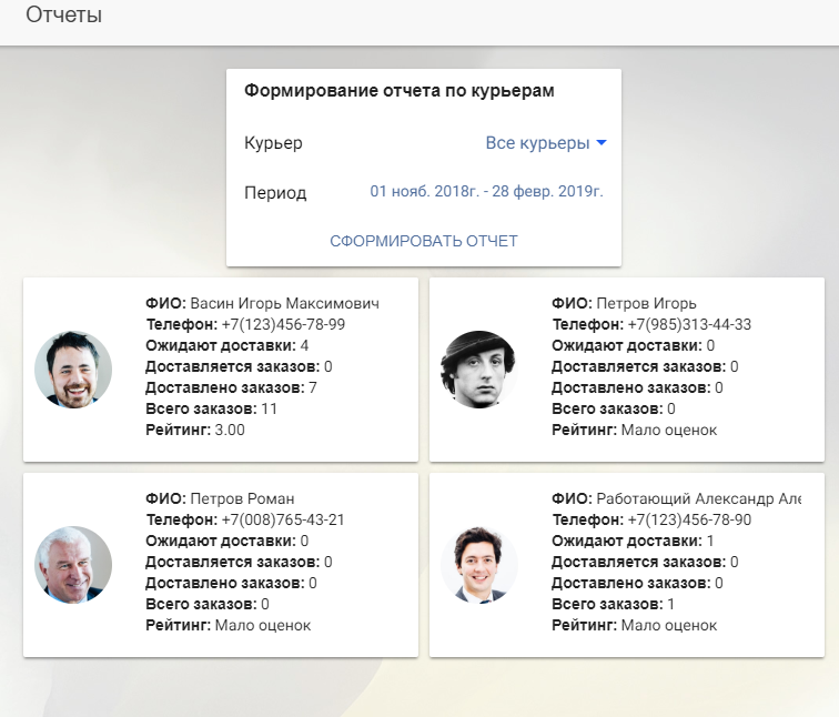 Следите за качеством оказываемых услуг доставки. Получайте отчеты по выполненным заказам и отзывы клиентов, следите за рейтингом курьеров и принимайте обоснованные кадровые решения. Мотивируйте курьеров работать лучше и повышать свой рейтинг.